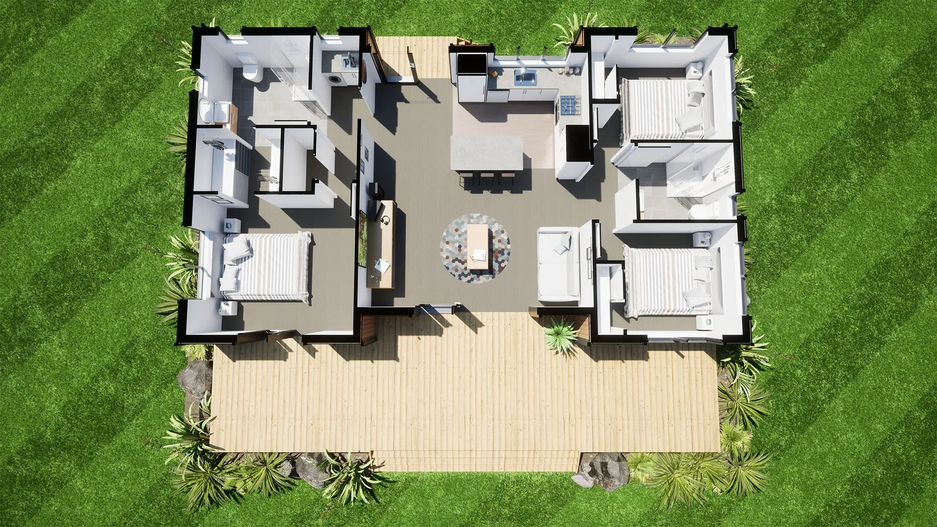 The Angus is our most popular design, made for those who need a bit more space in their at-home lives. It offers high ceilings and a central open-plan living area with an indoor-outdoor flow. The master bedroom stretches across one end of the house with its own ensuite, connected via a walk-in wardrobe. The other end you have two more bedrooms and a second bathroom.
