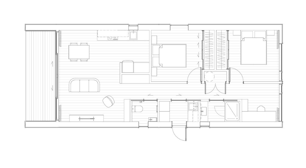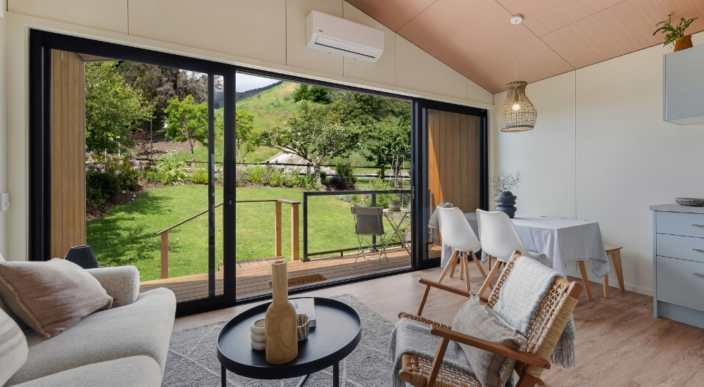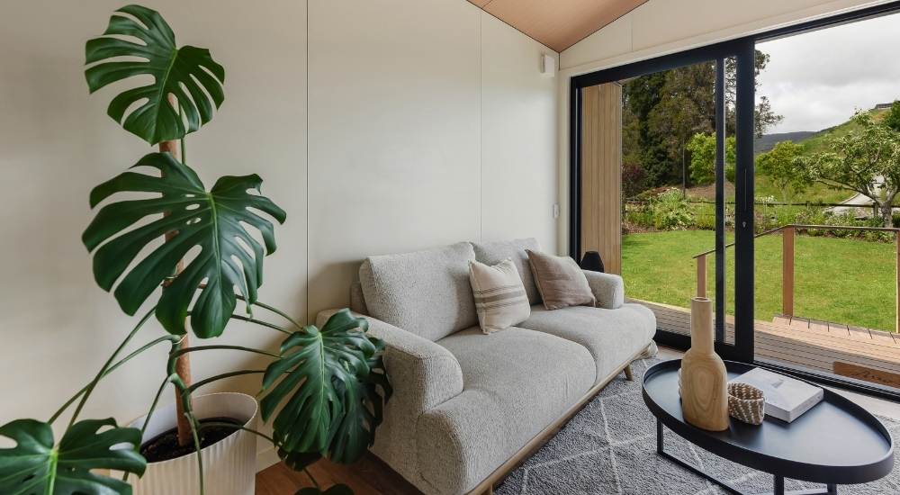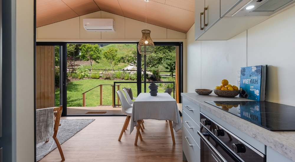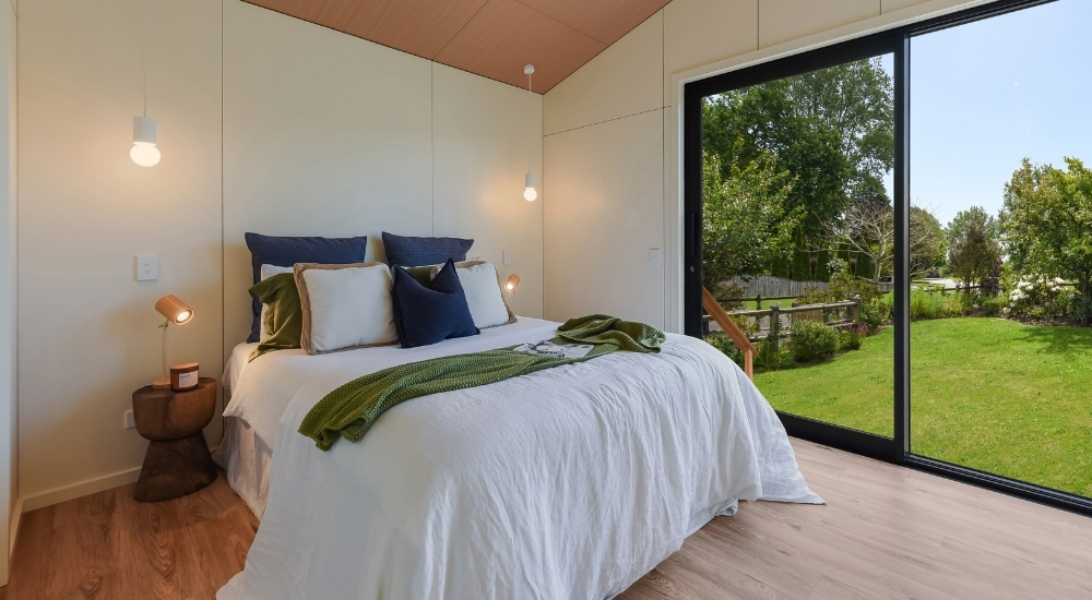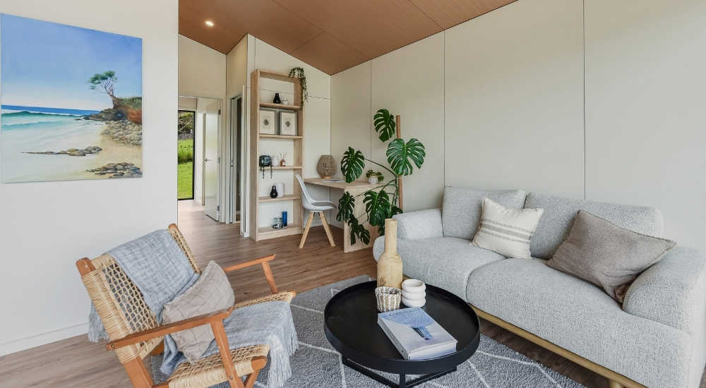 The Hampshire brings generous, flexible living to a smart 70m² design. Featuring two spacious bedrooms with double wardrobes and a dedicated ofce complete with built-in desk, it’s perfect for work, rest, and everything in between. Thoughtful touches, from ample storage and a separate laundry to a bathroom with large shower and powder room, make everyday living effortless. Soaring raked gable ceilings and expansive sliding doors fill the home with natural light, while the 10m² deck extends your living outdoors for year-round enjoyment.